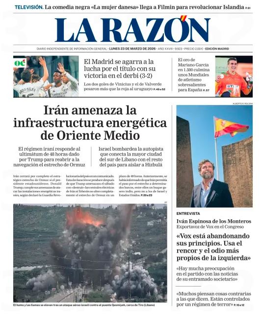 Portadas de la prensa internacional de este lunes 23 de marzo de 2026 Lapatilla marzo 22 2026, 7:25 pmPosteado en: PortadasCompártelo: Compartir en WhatsApp (Se abre en una ventana nueva) WhatsApp Compartir en Telegram (Se abre en una ventana nueva) Telegram Comparte en Facebook (Se abre en una ventana nueva) Facebook Compartir en X (Se abre en una ventana nueva) X Enviar un enlace a un amigo por correo electrónico (Se abre en una ventana nueva) Correo electrónico Compartir en LinkedIn (Se abre en una ventana nueva) LinkedIn ¡Únete al club ahora! Suscríbete al boletín más importante de Venezuela Compártelo: Compartir en WhatsApp (Se abre en una ventana nueva) WhatsApp Compartir en Telegram (Se abre en una ventana nueva) Telegram Comparte en Facebook (Se abre en una ventana nueva) Facebook Compartir en X (Se abre en una ventana nueva) X Enviar un enlace a un amigo por correo electrónico (Se abre en una ventana nueva) Correo electrónico Compartir en LinkedIn (Se abre en una ventana nueva) LinkedIn