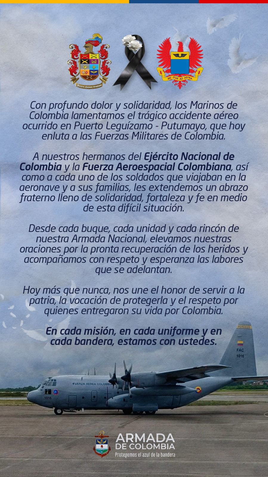 “Acompañamos a las familias de los héroes de la patria, víctimas de este lamentable accidente aéreo”, señaló la Armada, que además aseguró que mantiene oraciones por la recuperación de los heridos y reiteró su respaldo a las operaciones que continúan en la zona.
