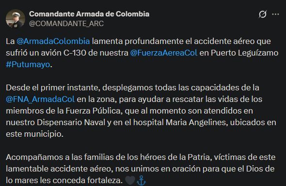 A través de un mensaje compartido en la cuenta de X del comandante de la institución, el almirante Juan Rozo, la fuerza naval manifestó su solidaridad con los afectados y confirmó el despliegue inmediato de sus capacidades en la región amazónica.