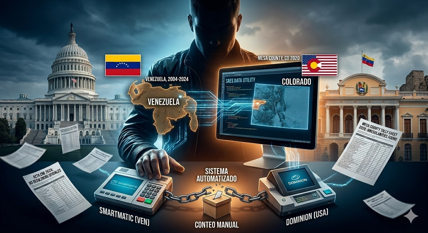 Pero esta historia no se queda allí. El abogado de Tina Peters, John Case, promovió testimonios que no fueron escuchados en el juicio por el sesgo político del caso, especialmente uno muy importante: un testigo venezolano, técnico en sistemas electorales, que dio un testimonio muy detallado en relación al sistema utilizado en el condado de Mesa, propiedad de la compañía Dominion Voting Systems, el mismo que, según su declaración, fue utilizado en Venezuela por la compañía Smartmatic. Y lo más interesante, la declaración completa de este testigo fue publicada en su totalidad en septiembre del año pasado 2025, después del encarcelamiento de Peters (ver la declaración completa en inglés, en Sworn Testimony of the venezuelan Smartmatic Whistleblower, en https://rumble.com/v6zg9u8-