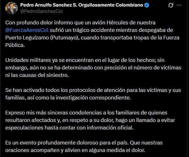 «Con profundo dolor informo que un avión Hércules de nuestra @FuerzaAereaCol sufrió un trágico accidente mientras despegaba de Puerto Leguízamo (Putumayo), cuando transportaba tropas de la Fuerza Pública», manifestó el ministro en su cuenta de X.