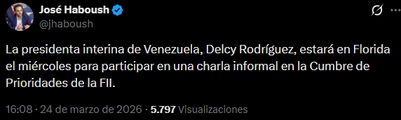 Delcy Rodríguez planificó un viaje al estado de Florida para participar el miércoles 25 de marzo en la cumbre FII Priority Miami. La asistencia de la sucesora de Nicolás Maduro fue confirmada en la programación de un panel de discusión programado dentro de las instalaciones del Hotel Faena.