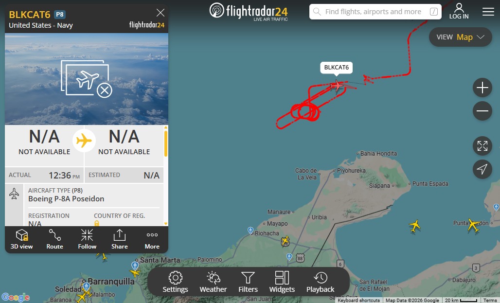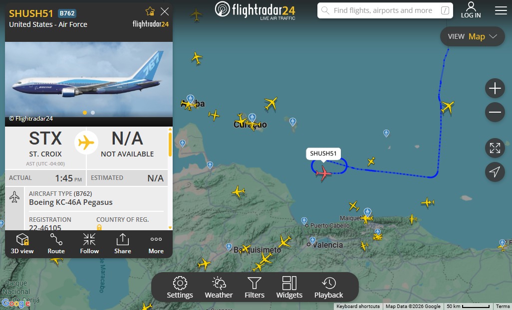 Dos aeronaves militares pertenecientes a las Fuerzas Armadas de Estados Unidos sobrevolaron el mar Caribe cerca de las costas de Venezuela para cumplir labores de vigilancia, inteligencia y reconocimiento, según se visualizó en el sistema de monitoreo aéreo Flightradar24.