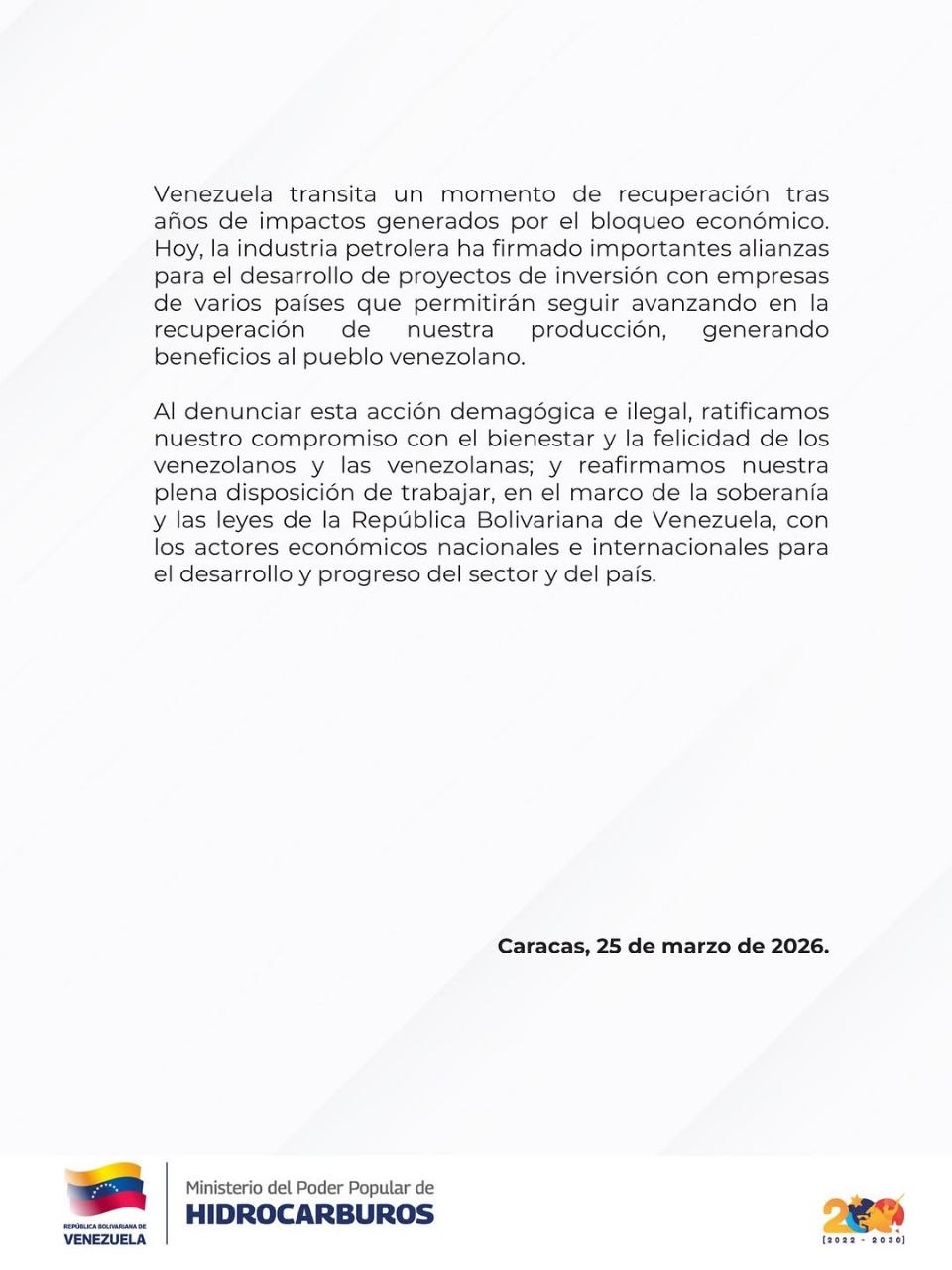 Ante esto, el chavismo evitó responder directamente a los planteamientos técnicos o económicos de la iniciativa. En su lugar, defendió el modelo actual, insistiendo en que los hidrocarburos son un “patrimonio irrenunciable” de Venezuela.