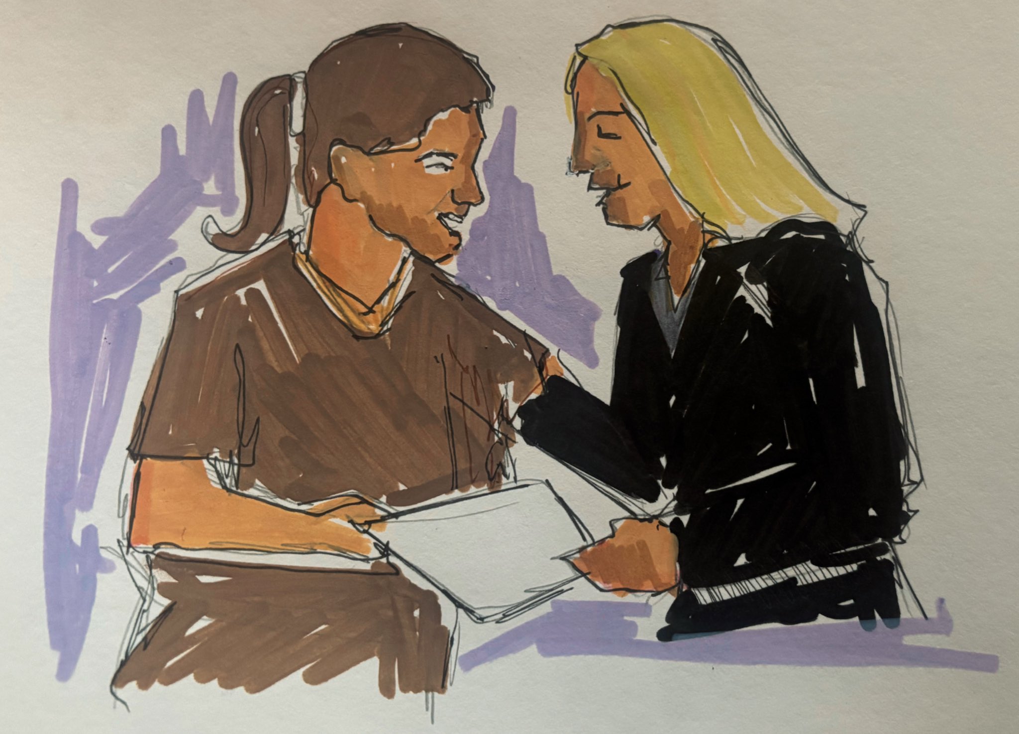 Otro boceto captura un momento de diálogo entre Flores y una mujer rubia, quien parece ser una abogada o asistente legal. Flores con auriculares y camisa marrón conversa sobre un documento, mientras la abogada con traje negro se inclina hacia ella.