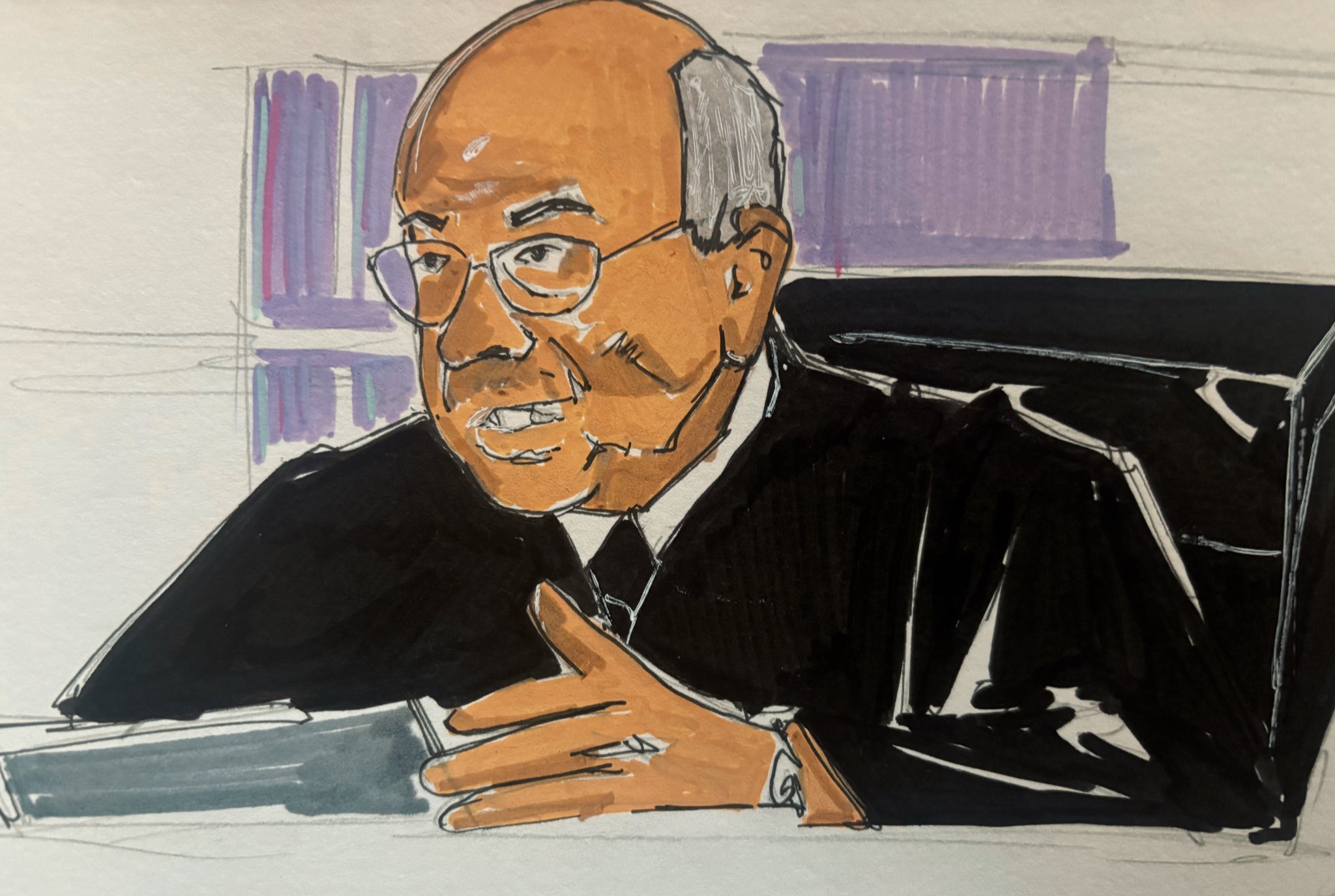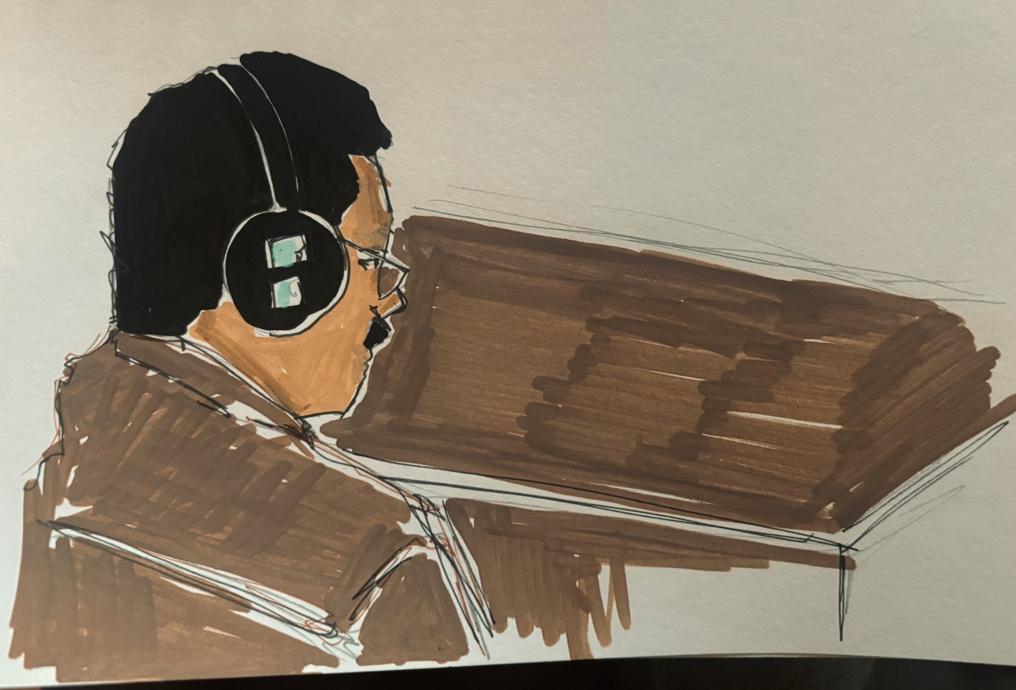 El artista también retrató al juez Alvin Hellerstein hablando desde el estrado con su túnica de juez y gafas redondas. Finalmente, un boceto mostró a Maduro de espaldas, sentado solo con los auriculares puestos, lo que detalló el aislamiento del caudillo durante el proceso legal.