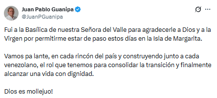 Juan Pablo Guanipa visitó la Basílica de Nuestra Señora del Valle durante su estancia en la Isla de Margarita para manifestar su devoción y agradecer por su recorrido en la entidad.