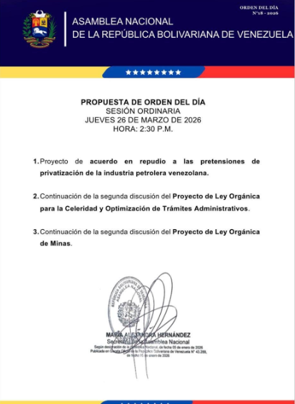 Posteriormente, el chavismo continuará la segunda discusión de dos proyectos de ley en la administración pública y el sector extractivo.