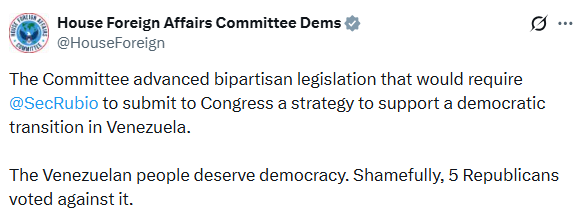 «El pueblo venezolano merece democracia. Vergonzosamente, 5 republicanos votaron en contra», precisó la declaración publicada tras la votación.