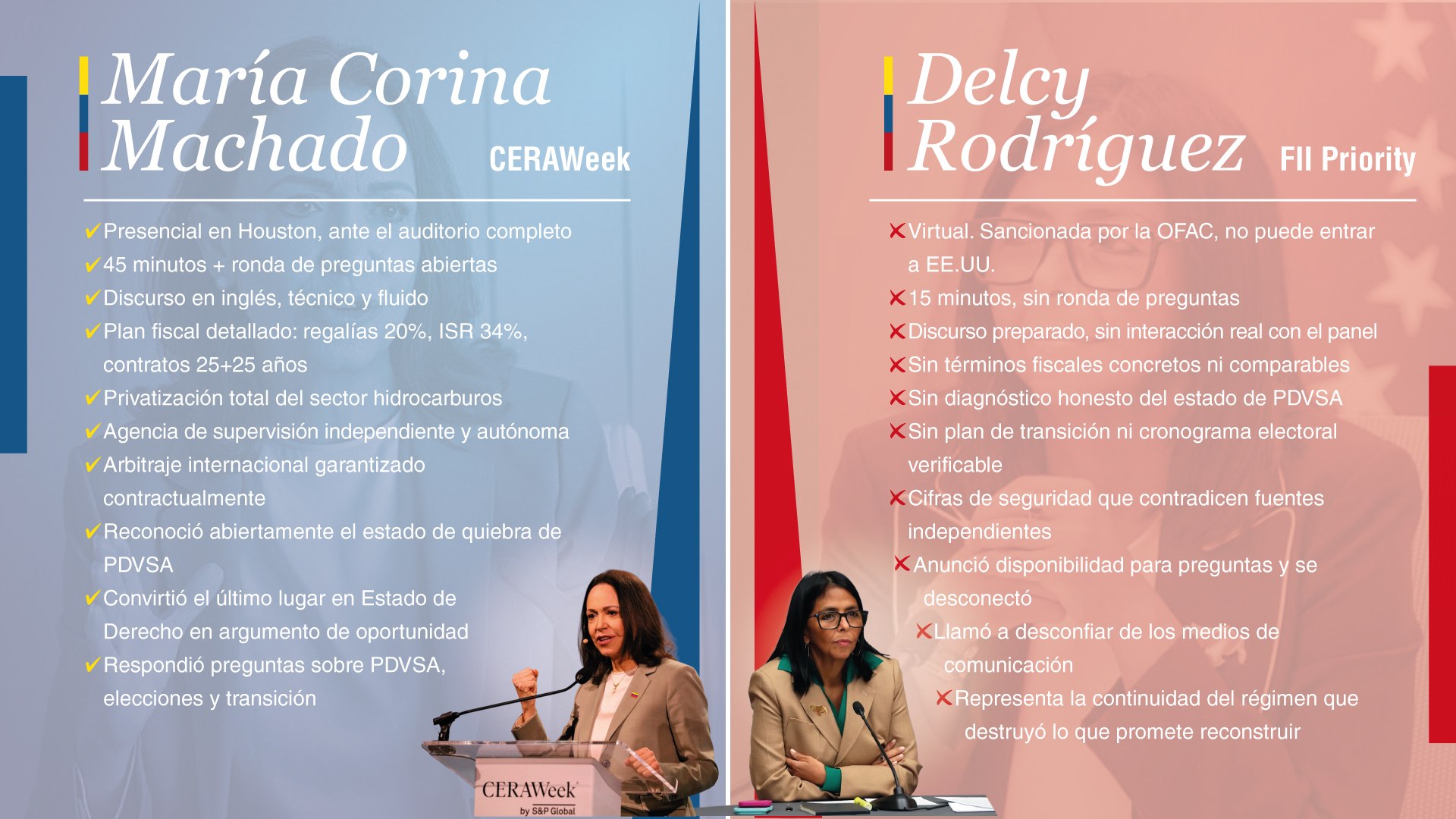 Una lideresa que llega en persona, habla 45 minutos, da números específicos y se que da a responder las preguntas incómodas — sobre PDVSA, sobre el Estado de Derecho, sobre las elecciones, sobre cómo se garantiza que lo prometido se cumpla — envía una señal radicalmente distinta a la de una funcionaria que aparece 15 minutos en pantalla, no puede pisar el país donde se celebra el evento, y se despide antes de que empiece el escrutinio.