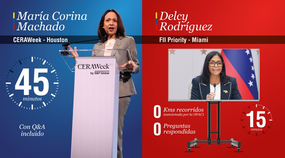 A veces la historia tiene buen sentido del tiempo. En menos de 24 horas, y sin que nadie lo hubiera planeado así, el mundo de las inversiones energéticas pudo ver cara a cara las dos propuestas de Venezuela: la de una lideresa en Houston, presente en el escenario, respondiendo preguntas en inglés ante las empresas más poderosas del sector; y la de una funcionaria en Miami que apareció en pantalla durante 15 minutos, leyó sus cifras, anunció que estaba «a la disposición para las preguntas» y se desconectó.