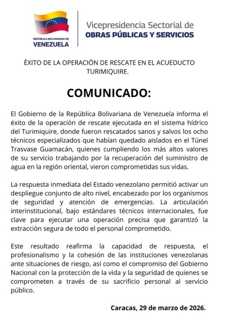 A través de un comunicado oficial, el chavismo detalló que el grupo de trabajadores vio comprometida su vida tras quedar atrapados específicamente en el Túnel Trasvase Guamacán. El documento destacó que estos profesionales se encontraban cumpliendo con sus labores de servicio para la recuperación y mantenimiento del suministro hídrico que abastece a la región oriental de Venezuela.