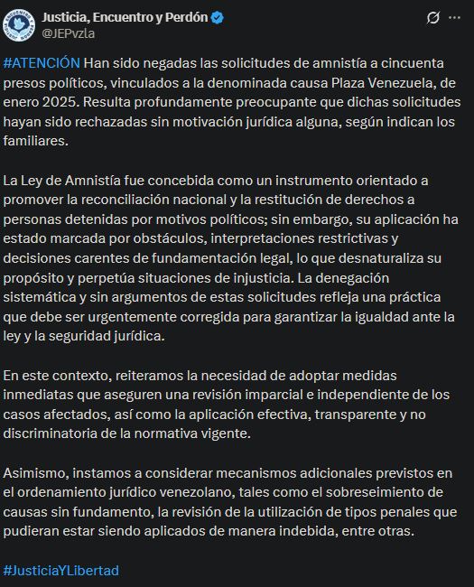 La ONG Justicia, Encuentro y Perdón (JEP) denunció este lunes que fueron rechazadas las solicitudes de amnistía para 50 presos políticos vinculados al caso Plaza Venezuela, correspondiente a enero de 2025, sin que existiera una justificación legal para dicha decisión.