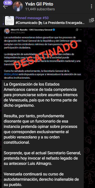 «Resulta profundamente disonante que un funcionario de esa instancia pretenda opinar sobre procesos que corresponden exclusivamente al pueblo venezolano», afirmó Gil.