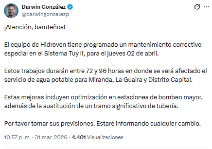 Hidroven anunció la ejecución de un mantenimiento en el Sistema Tuy II programado para este jueves 2 de abril.
