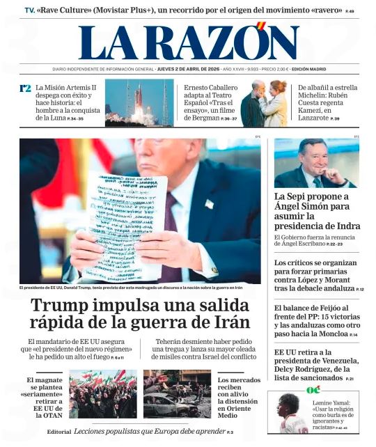 Portadas de la prensa internacional de este jueves 2 de abril de 2026 Lapatilla abril 01 2026, 7:31 pmPosteado en: PortadasCompártelo: Compartir en WhatsApp (Se abre en una ventana nueva) WhatsApp Compartir en Telegram (Se abre en una ventana nueva) Telegram Comparte en Facebook (Se abre en una ventana nueva) Facebook Compartir en X (Se abre en una ventana nueva) X Enviar un enlace a un amigo por correo electrónico (Se abre en una ventana nueva) Correo electrónico Compartir en LinkedIn (Se abre en una ventana nueva) LinkedIn ¡Únete al club ahora! Suscríbete al boletín más importante de Venezuela Compártelo: Compartir en WhatsApp (Se abre en una ventana nueva) WhatsApp Compartir en Telegram (Se abre en una ventana nueva) Telegram Comparte en Facebook (Se abre en una ventana nueva) Facebook Compartir en X (Se abre en una ventana nueva) X Enviar un enlace a un amigo por correo electrónico (Se abre en una ventana nueva) Correo electrónico Compartir en LinkedIn (Se abre en una ventana nueva) LinkedIn