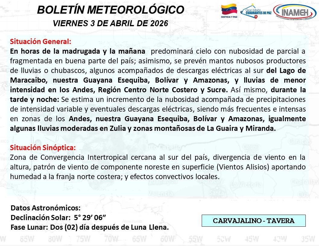 De acuerdo con el reporte, las condiciones climáticas se intensificarán durante la tarde y la noche debido a la actividad en la Zona de Convergencia Intertropical y el aporte de humedad de los vientos alisios. Se estima un incremento de la nubosidad con lluvias de intensidad variable y descargas eléctricas, siendo más frecuentes en las zonas montañosas de Miranda y La Guaira, así como en las regiones andina y sur del país.