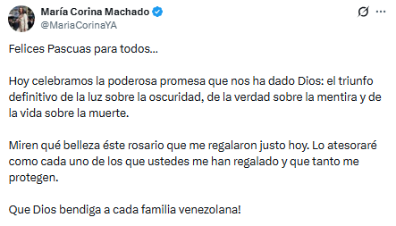 María Corina Machado compartió un mensaje con motivo de las festividades de Pascua a través de su cuenta en X, en el que habló de la espiritualidad y el optimismo.