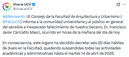 La comunidad universitaria de la Universidad Central de Venezuela (UCV) se encuentra de luto tras confirmarse el fallecimiento del Dr. Francisco Javier Caricatto Masci, Decano de la Facultad de Arquitectura y Urbanismo.