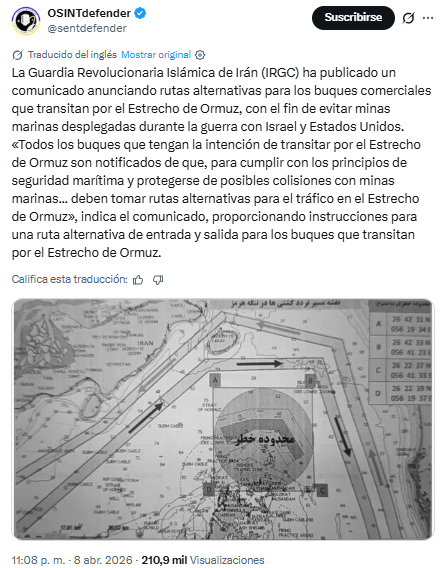 Según esta información, el Cuerpo de la Guardia Revolucionaria Islámica ha compartido este gráfico en el que insta a los buques comerciales a evitar estos explosivos submarino letales que fueron supuestamente desplegados tras el inicio de los bombardeos de Estados Unidos e Israel contra Irán. «Se notifica a todos los buques que tengan previsto transitar por el estrecho de Ormuz que, para cumplir con los principios de seguridad marítima y protegerse de posibles colisiones con minas marinas, deberán utilizar rutas alternativas para el tráfico en el estrecho de Ormuz», reza el comunicado.
