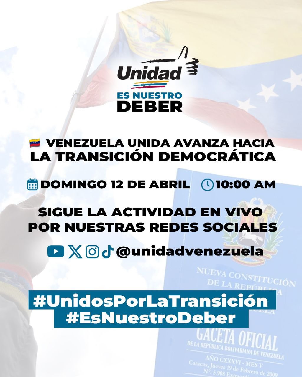 La Plataforma Unitaria Democrática (PUD) anunció que este domingo 12 de abril presentará al país la hoja de ruta para avanzar hacia una transición en Venezuela, en el marco de un encuentro nacional que será transmitido a través de sus redes sociales.
