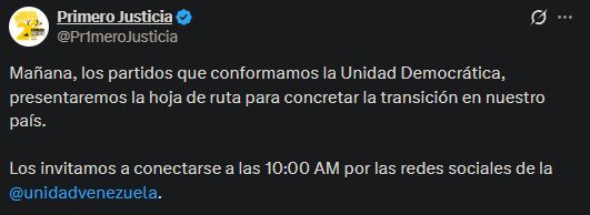 “Mañana, los partidos que conformamos la Unidad Democrática presentaremos la hoja de ruta para concretar la transición en nuestro país”, señaló la organización en su publicación, acompañada de una imagen con el mensaje: “Venezuela unida avanza hacia la transición democrática”.