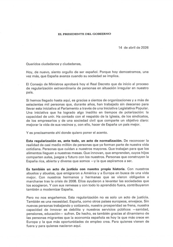 En una carta a la ciudadanía firmada este martes, el presidente del Gobierno español, el socialista Pedro Sánchez, asegura que esta medida es un acto de «normalización» al reconocer la realidad de casi medio millón de personas que ya forman parte de la vida cotidiana de los españoles, cuidan de sus mayores, trabajan para que los alimentos lleguen a sus mesas y emprenden.