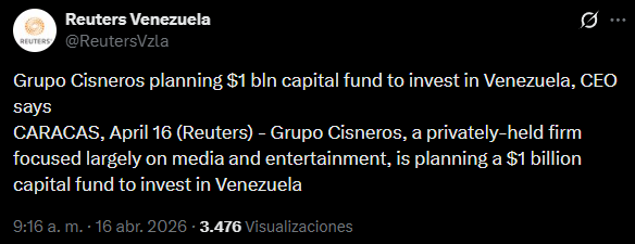 Grupo Cisneros, una empresa privada centrada principalmente en medios de comunicación y entretenimiento, planea un fondo de capital de 1.000 millones de dólares para invertir en Venezuela.