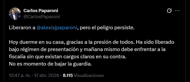 A través de su cuenta en la red social X, Paparoni aseguró que, aunque ya se encuentra en su casa, la situación sigue siendo delicada, ya que fue excarcelado bajo régimen de presentación.