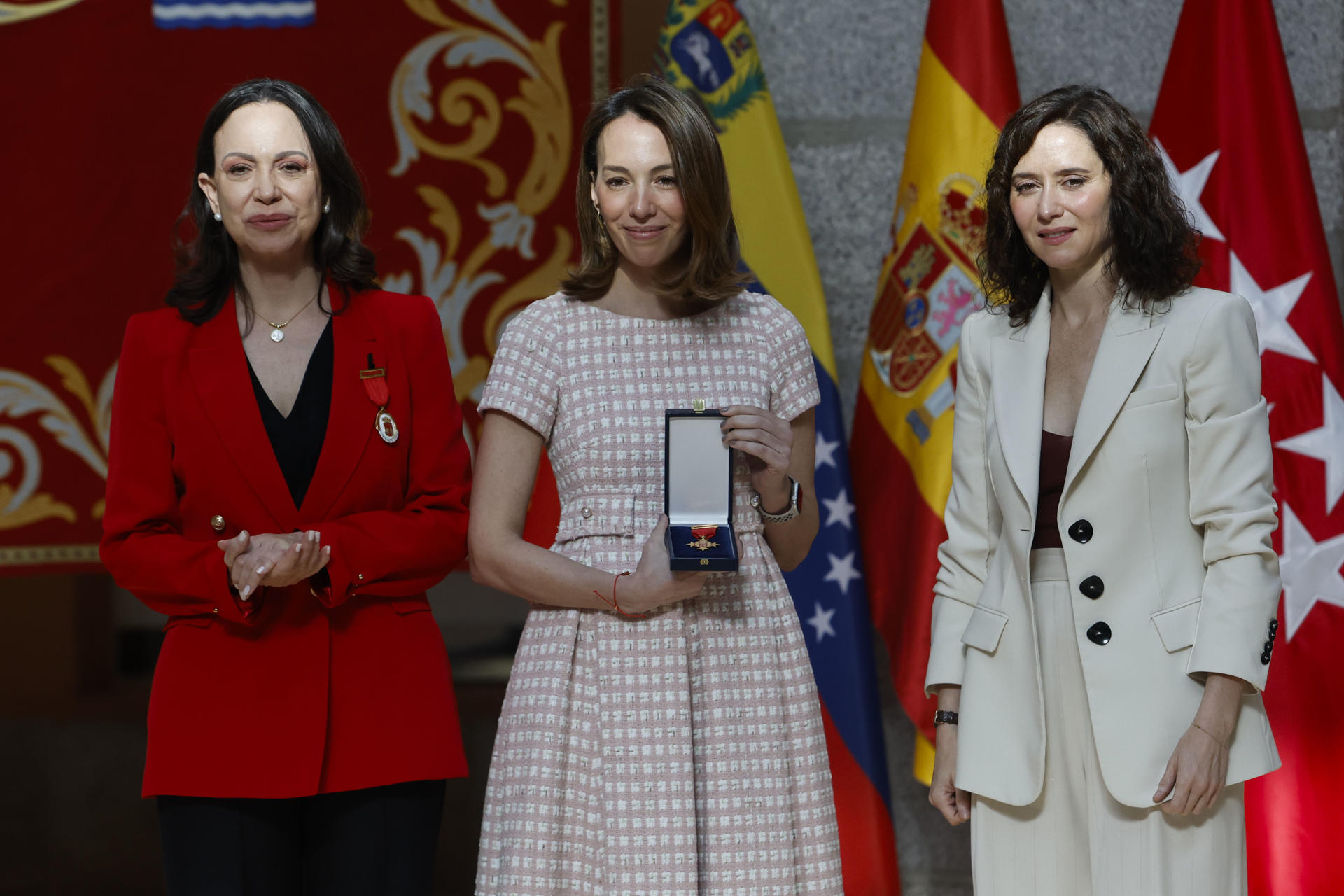La presidenta de la Comunidad de Madrid, Isabel Díaz Ayuso, entregó este sábado la Medalla de Oro a la líder opositora venezolana y Premio Nobel de la Paz, María Corina Machado, en un acto celebrado en la Real Casa de Correos.