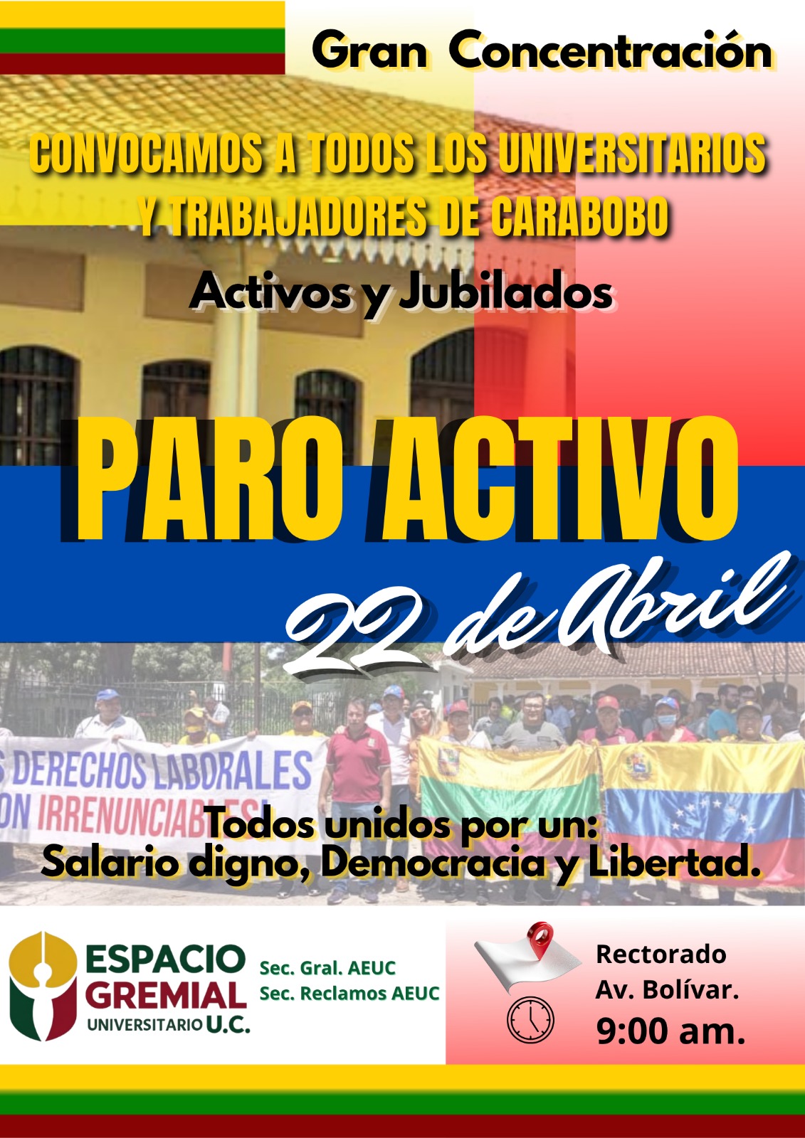 Movimientos gremiales y sindicatos carabobeños anunciaron este lunes la convocatoria a un paro de 24 horas de trabajadores activos, jubilados y pensionados que iniciará el próximo miércoles 22 de abril, con la intención de exigir mejores condiciones salariales y laborales.