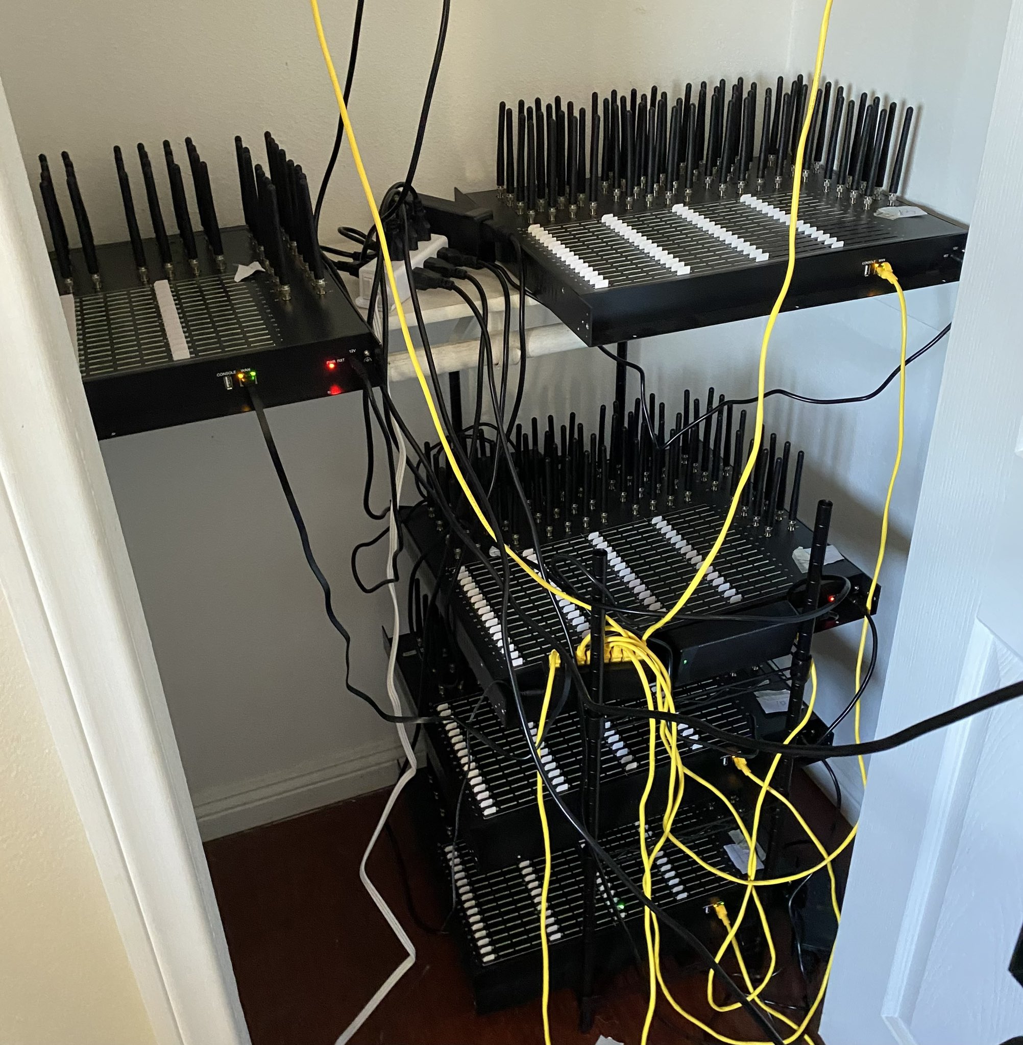 Las fotografías difundidas en el comunicado de HSI mostraban filas de dispositivos electrónicos y antenas negras, conocidos como «cajas SIM», dispuestas en la acera y dentro de una vivienda, junto con un ejemplo de un mensaje de texto fraudulento.