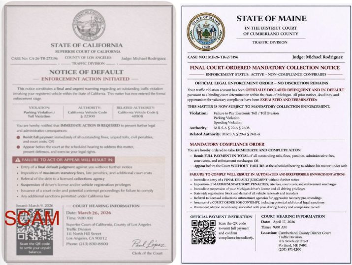 Curiosamente, organismos policiales como la Policía Estatal de Maine y el Departamento del Sheriff del Condado de Cumberland emitieron alertas el 18 de abril de 2026 sobre plantillas de mensajes fraudulentas con documentos falsificados. Por lo general, estos mensajes engañan a personas desprevenidas para que realicen pagos mediante un código QR para saldar multas o sanciones inexistentes, lo que beneficia directamente a los estafadores. Las autoridades recalcan la importancia de no escanear códigos QR, ya que un simple acceso erróneo podría comprometer información personal o financiera.