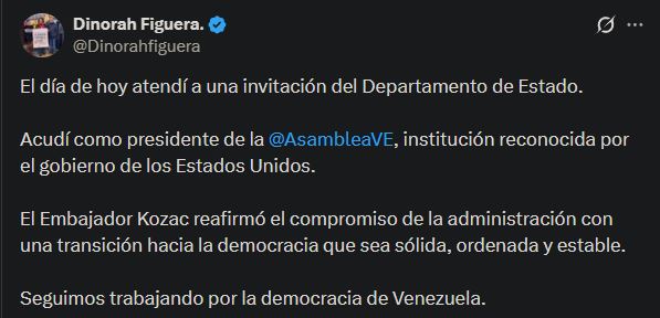 “El día de hoy atendí a una invitación del Departamento de Estado. Acudí como presidente de la Asamblea Nacional, institución reconocida por el gobierno de los Estados Unidos. El embajador Kozak reafirmó el compromiso de la administración con una transición hacia la democracia que sea sólida, ordenada y estable. Seguimos trabajando por la democracia de Venezuela”, escribió.
