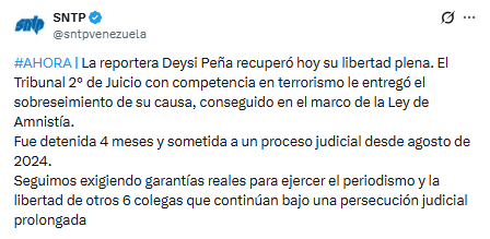 El Sindicato Nacional de Trabajadores de la Prensa (SNTP) informó que la periodista Deysi Peña recuperó este viernes su libertad plena.