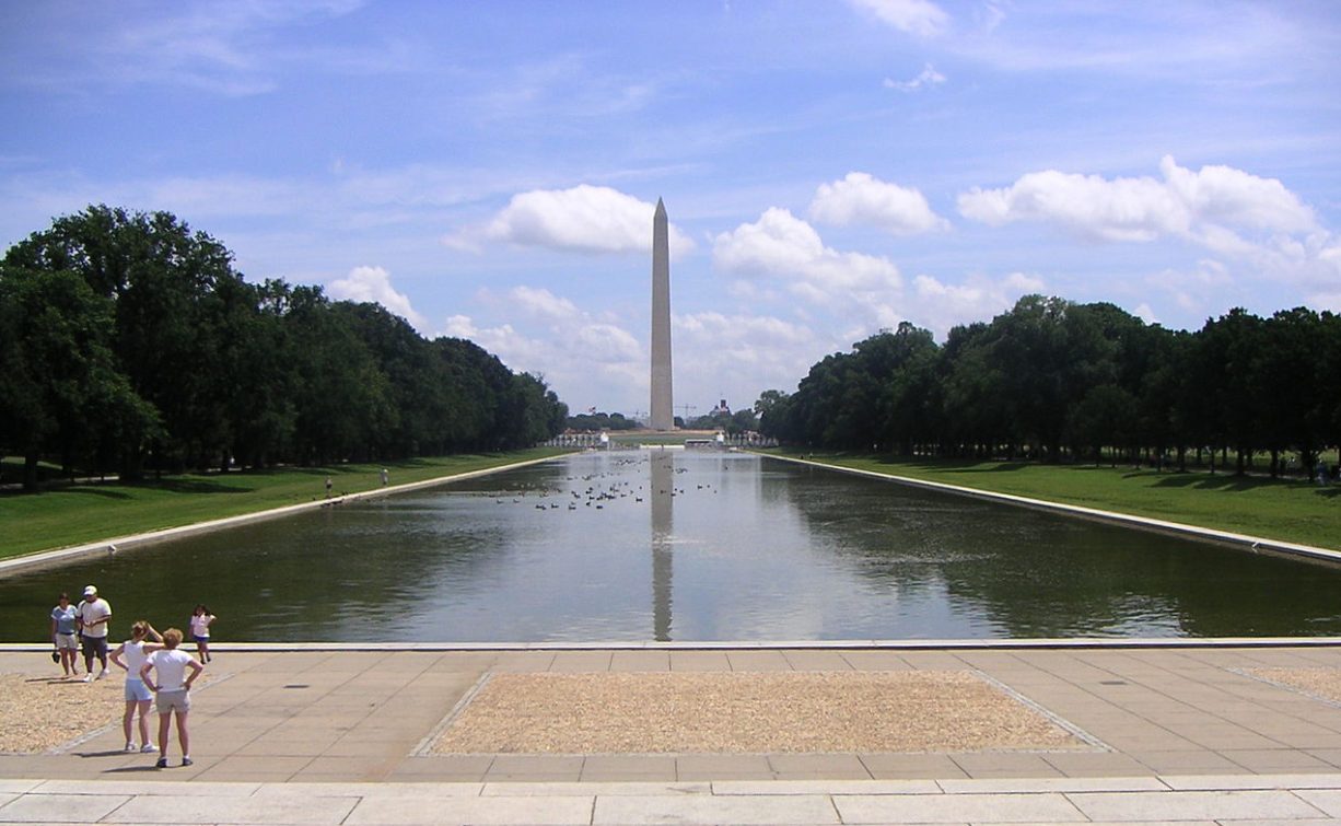 El estanque, ubicado junto al monumento a Lincoln y con la Explanada Nacional y el Capitolio de fondo, fue construido en la década de 1920.