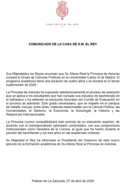 «Sus Majestades los Reyes anuncian que Su Alteza Real la Princesa de Asturias cursará el Grado de Ciencias Políticas en la Universidad Carlos III de Madrid. El programa académico tiene una duración de cuatro años y se iniciará en el tercer cuatrimestre de 2026», señala el comunicado de la Casa Real.
