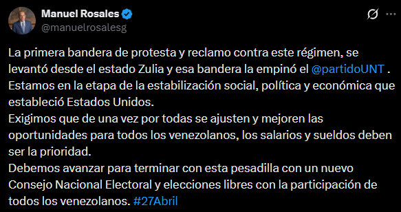 «Debemos avanzar para terminar con esta pesadilla con un nuevo Consejo Nacional Electoral y elecciones libres con la participación de todos los venezolanos», sentenció Rosales.