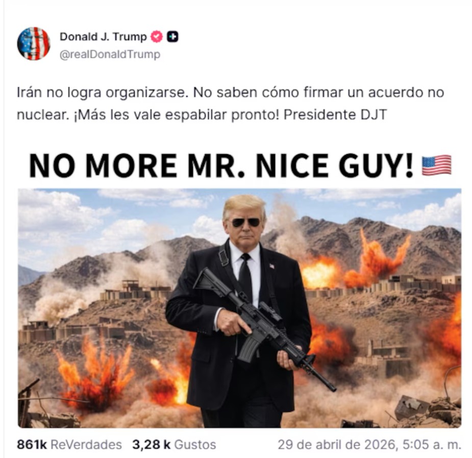 Trump, que la semana pasada extendió el alto el fuego con Teherán de manera indefinida, acompañó el mensaje de una imagen simulada en la que aparece armado y con gafas de sol, mientras varias explosiones suceden tras él, acompañada de la frase «¡NO MÁS SR. AMABLE!».