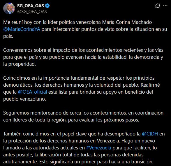 El secretario general reafirmó la disposición de la OEA a brindar apoyo en beneficio del pueblo venezolano y aseguró que la organización continuará monitoreando de cerca los acontecimientos, en coordinación con líderes de la región, para evaluar los próximos pasos.