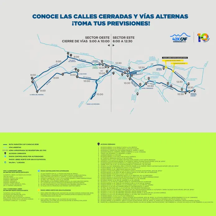 La carrera reunirá más de 10 mil corredores en sus modalidades de 10, 21 y 42 kilómetros de distancia, tendrá como punto de salida el Parque Sucre Los Caobos y espera que el cierre inicie a partir de las 5:00 a.m. en el oeste y de las 6:00 a.m. en el este; con apertura progresiva a medida que avance la carrera.