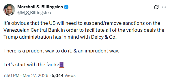 El exfuncionario estadounidense señaló a través de su cuenta en la red social X que resulta evidente la intención de la administración Trump de suspender las restricciones para facilitar acuerdos económicos con la gestión de Delcy Rodríguez. Sin embargo, Billingslea recordó que la institución financiera fue sancionada en 2019 bajo su mandato en el Tesoro por ser una herramienta para el saqueo de activos, por lo que advirtió que existe «una manera prudente de hacerlo, y una imprudente».